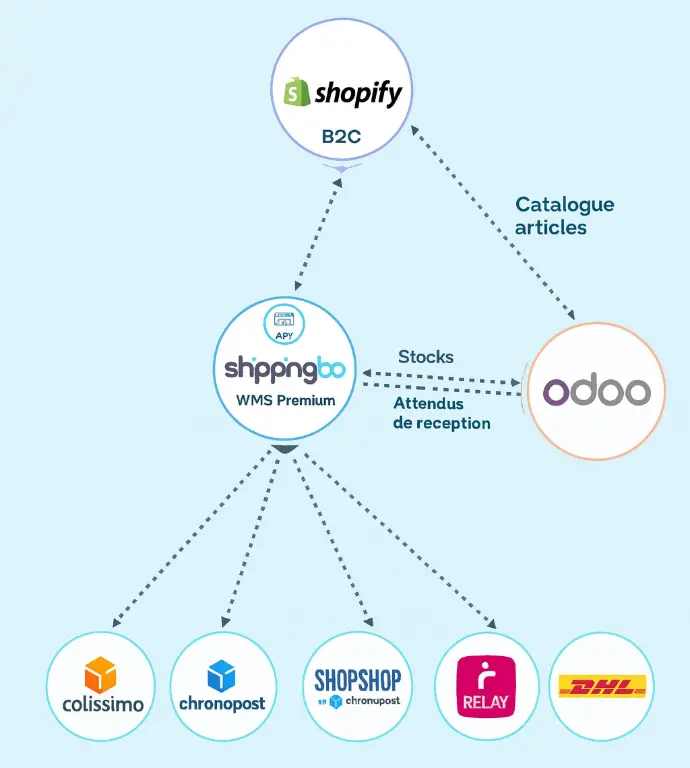 - ShippingBo est utilisé comme WMS pour gérer le stock et la préparation des commandes.