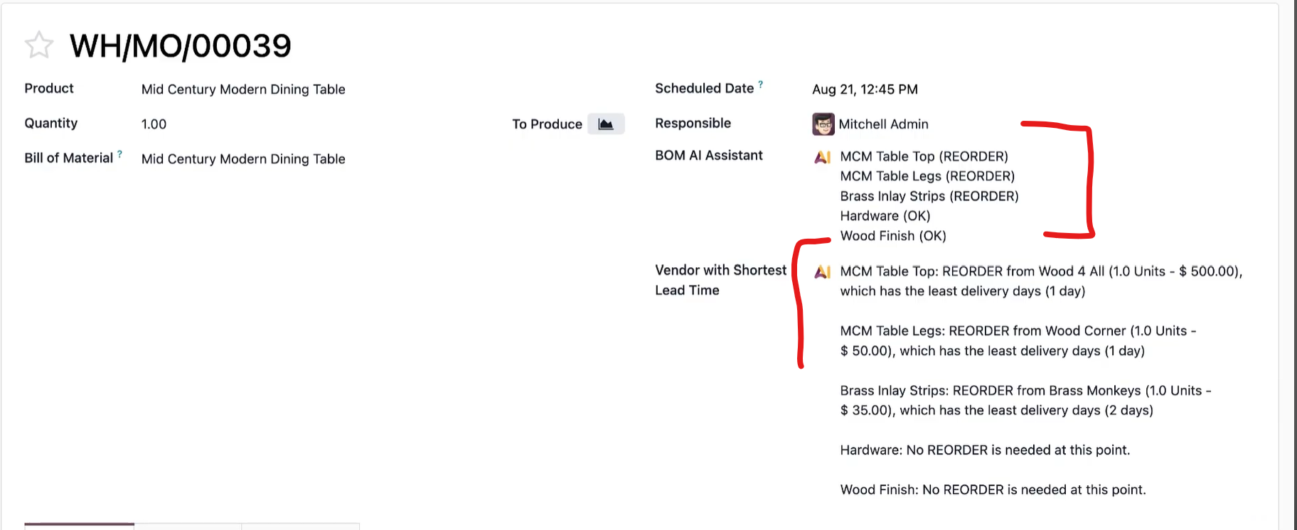 - Pour la sélection des fournisseurs : Imaginez devoir commander des dizaines de composants, chacun disponible chez plusieurs fournisseurs avec des délais différents. L'IA d'Odoo analyse une BoM entière, compare instantanément les délais de tous les fournisseurs pour chaque composant et recommande la combinaison la plus rapide. Cela peut augmenter l'efficacité jusqu'à 25 % et, plus important encore, améliorer les taux de production dans les délais de 15 à 20 %.
